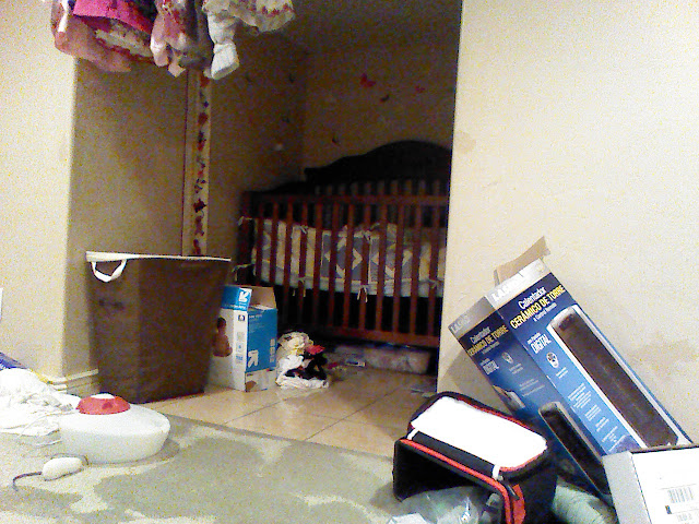 That's when I look across the room towards where it shares a wall with the bathroom. Oh my gosh. So much for letting ems sleep in... We grabbed her from the crib and started moving things from our room as fast as we could. Our bed hasn't been on the game because it was hard for me to get on when I was pregnant and we just haven't put it on since. So, we moved it as quickly as we could do as not to ruin the box spring.